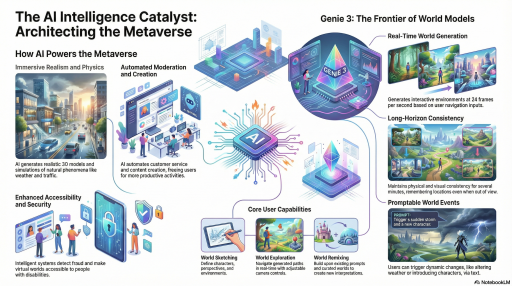 Artificial intelligence (AI) serves as the primary “intelligence catalyst” for the metaverse, transforming it into a realistic, immersive, and personalized experience. By generating 3D models, simulating natural phenomena (like weather and traffic), and providing personalized content tailored to user data, AI makes virtual spaces more relevant and engaging. Major tech entities are already utilizing these capabilities: Meta is developing expressive avatars, Microsoft is creating virtual worlds for professional training, and Google is advancing augmented reality through AR glasses. Furthermore, AI improves security by detecting fraud and enhances accessibility for users with disabilities.